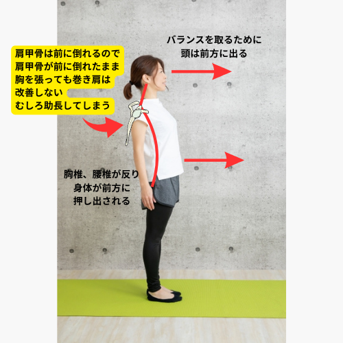 その状態にも関わらず胸を張り続けていても改善はしないばかりかむしろ巻き肩を助長してしまいます