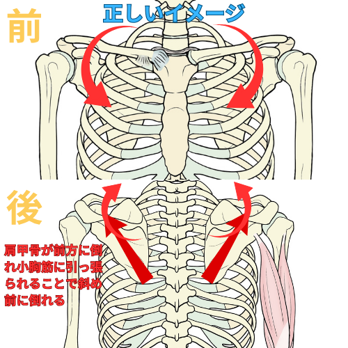 本来は肩甲骨が前方に倒れ、小胸筋の作用で斜め前に引っ張られている状態です