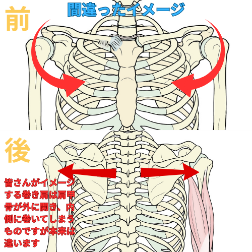 一般的に巻き肩は肩甲骨が外に広がり 内側に巻かれているイメージだと思いますが実際にそうではありません